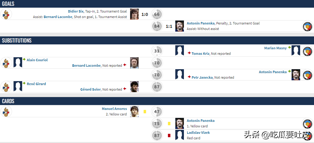 1982年世界杯维泽克。 虽然这是世界杯首次完成扩军,但红牌数量并没有增加。 D组最后一轮法国与捷克斯洛伐克的比赛中,捷克斯洛伐克球员维泽克在比赛最后时刻被罚下场。 成为本届世界杯第一个被罚下场的球员。